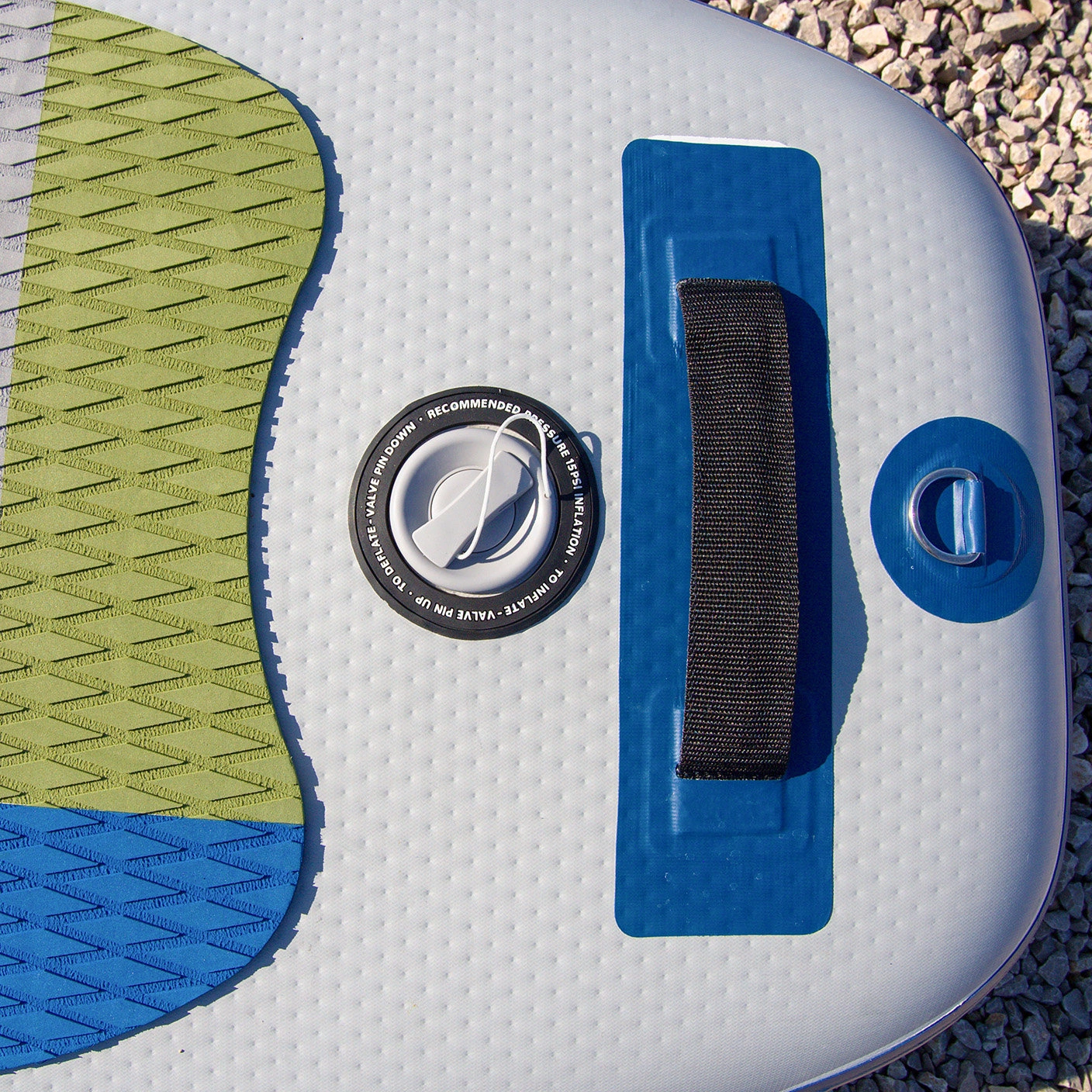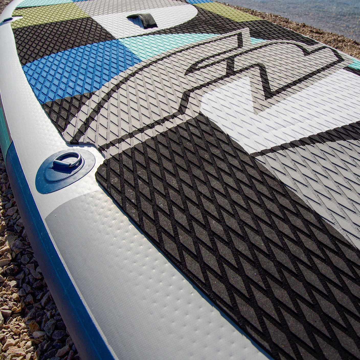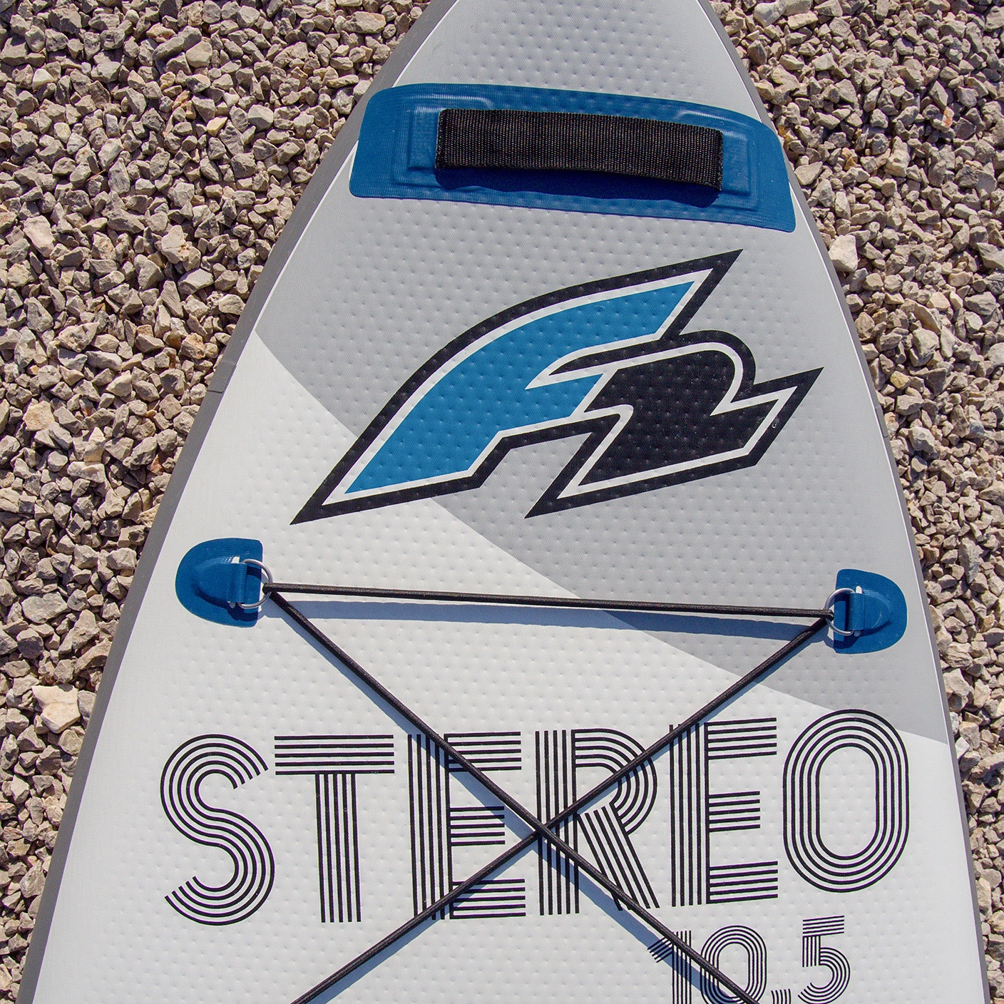 Paddleboard F2 Stereo posiada 3 uchwyty ułatwiające transport oraz odpowiednio rozstawione 4 mocowania typu D-ring umożliwiające zamocowanie siedziska kajakowego (nie jest on częścią tego zestawu). Na dziobie znajduje się elastyczna linka typu Bungy, która służy do przymocowania i ustabilizowania rzeczy osobistych jakie chcesz zabrać ze sobą na deskę. Rekomendujemy spakowanie swojego bagażu w wodoszczelną torbę, aby zapobiec zamoczeniu lub zgubieniu swoich rzeczy. Ta deska SUP wyposażona jest w układ trzech stateczników 2 + 1 - dwa małe, elastyczne, zamocowane na stałe finy oraz jeden duży, wyjmowany statecznik kompatybilny z systemem US-Box. Pokład deski jest pokryty warstwą antypoślizgowej pianki EVA, która jest bardzo komfortowa w dotyku, a dzięki specjalnie wyciętej strukturze diamond zapewnia dużą przyczepność i zapobiega ślizganiu się. W skład zestawu nie wchodzi leash czyli linka łącząca deskę z użytkownikiem. Należy ją dokupić oddzielnie.
