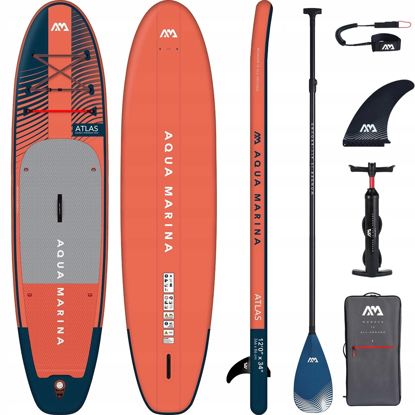 Tegoroczny model Atlas należy do linii Advanced i cechuje się kilkoma ulepszeniami względem standardowych modeli. Jest sztywniejszy dzięki zastosowaniu technologii Double Stringer oraz pokryty grubszą i bardziej przyczepną pianką EVA w kształcie diamentów. Na rufie znajduje się kick pad ułatwiający wykonywanie skrętów i pływanie na falach a na dziobie podwójna linka bungy pozwalająca na przypięcie bagażu. Akcesoria (w tym karbonowe wiosło) będące częścią zestawu również są wyższej jakości niż standardowy sprzęt Aqua Marina. Paddleboard posiada mocowania typu d-ring, które pozwalają na przymocowanie siedziska kajakowego i pływanie na siedząco. Nie jest ono częścią zestawu ale znajdziesz je tutaj.