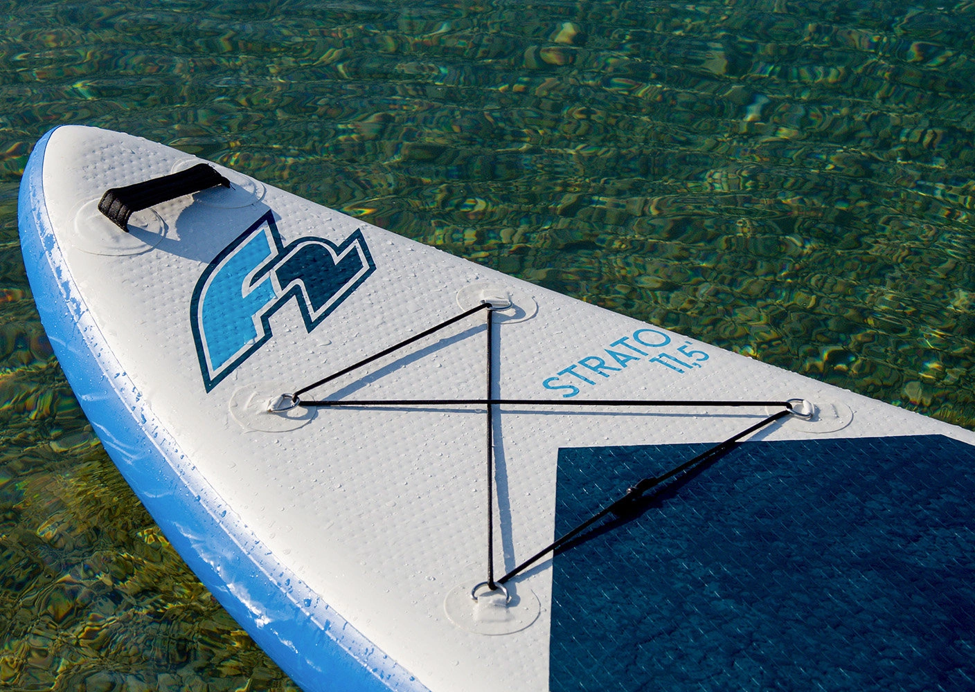 Model Strato 10'5 pochodzący od niemieckiego producenta F2 należy do kategorii desek uniwersalnych, bardzo stabilnie zachowujących się na wodzie. Dlatego kategoria ta rekomendowana jest dla osób, które wcześniej nie miały kontaktu z paddleboardingiem. Nie jest to jednak klasyczny allround. Spiczasty kształt oraz ścięta rufa powodują, że deska sprawdzi się również podczas dalszych wypraw co z pewnością docenią doświadczeni supowicze. Paddleboard Strato został stworzony do pływania po wodach spokojnych oraz na lekkich falach. Wymiary deski (320x83x15 cm) dają całkowitą wyporność wynoszącą 290 l oraz udźwig wynoszący 120 kg. Bazując na naszym doświadczeniu rekomendujemy jednak, żeby maksymalna waga jednego wioślarza stojącego na środku deski nie przekraczała 95-100 kg. Konstrukcja oparta jest na wewnętrznej strukturze Drop-Stitch oraz 2-warstwowej, termicznie zgrzewanej technologii HFT (Heat Fusion Technology).