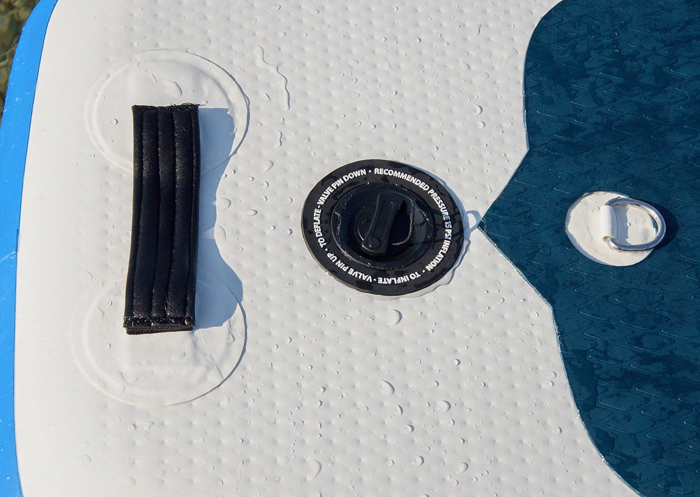 Paddleboard posiada 3 uchwyty ułatwiające transport oraz odpowiednio rozstawione 4 mocowania typu D-ring umożliwiające zamocowanie siedziska kajakowego, będącego częścią tego zestawu. Na dziobie znajduje się elastyczna linka typu Bungy, która służy do przymocowania i ustabilizowania rzeczy osobistych jakie chcesz zabrać ze sobą na deskę. Rekomendujemy spakowanie swojego bagażu w wodoszczelną torbę, aby zapobiec zamoczeniu lub zgubieniu swoich rzeczy. Ta deska SUP wyposażona jest w układ trzech stateczników 2 + 1 - dwa małe, elastyczne, zamocowane na stałe finy oraz jeden duży, wyjmowany statecznik kompatybilny z systemem US-Box. Pokład deski jest pokryty warstwą antypoślizgowej pianki EVA, która jest bardzo komfortowa w dotyku, a dzięki specjalnie wyciętej strukturze diamond zapewnia dużą przyczepność i zapobiega ślizganiu się. W skład zestawu nie wchodzi leash czyli linka łącząca deskę z użytkownikiem. Należy ją dokupić oddzielnie.