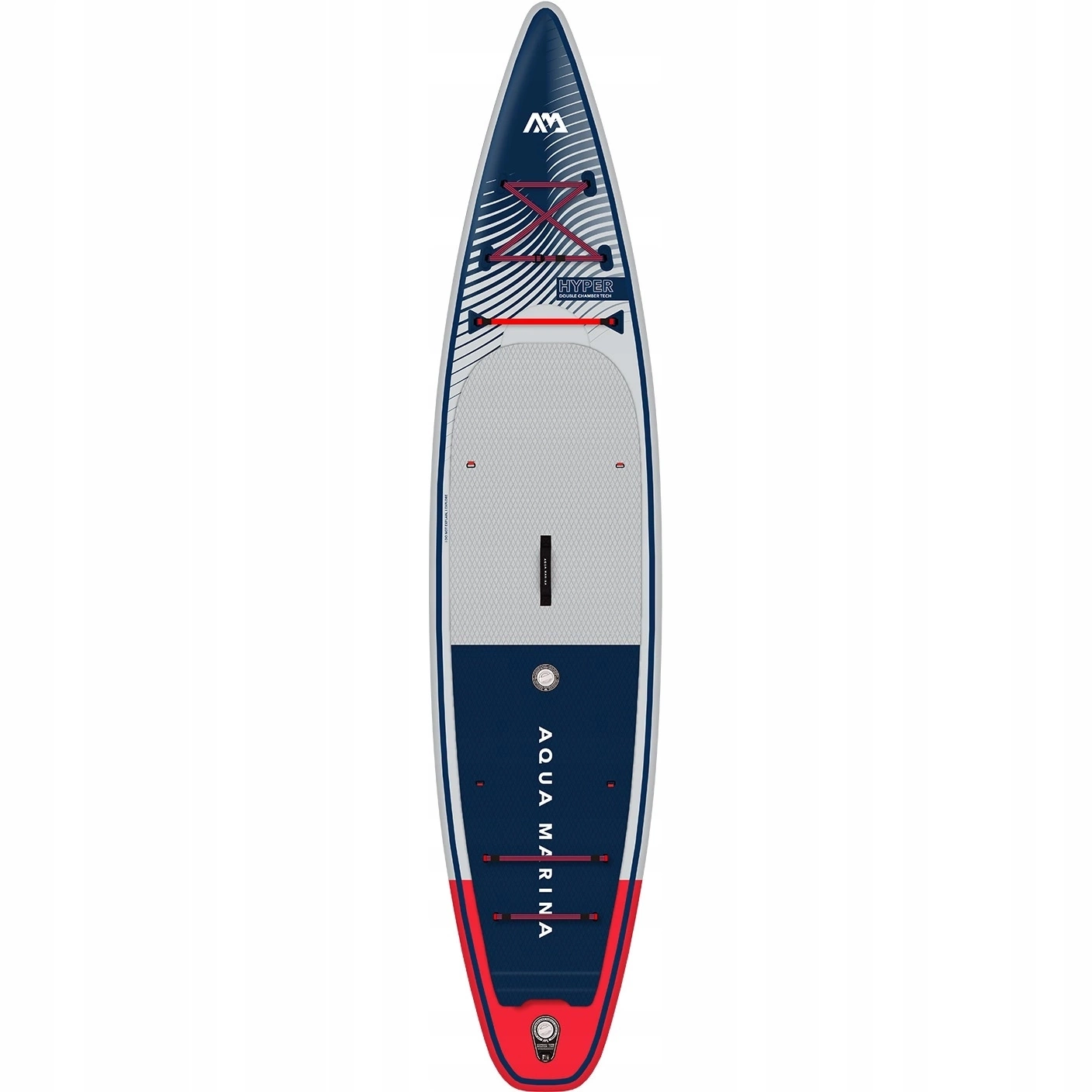 Tegoroczny model Hyper to zaawansowana touringowa deska, którą cechuje podwójna komora (Double Chamber Technology), burty na całej długości wzmocnione drugą warstwą materiału (Double Stringer Technology), dwie linki bungy pozwalające zabrać więcej bagażu, pokrycie grubszą i bardziej przyczepną pianką imitującą piasek - Sand Ripple, kickpad na rufie pozwalający na szybsze wykonywanie zwrotów czy REC Edge™ - technologia zastosowana na rufie zwiększająca efektywność wiosłowania poprzez lepsze odprowadzanie wody. Dodatkowo dziób został wzmocniony technologią Fore Keel™, która pozwala na lepsze trzymanie kierunku podczas wiosłowania oraz chroni deskę przy dobijaniu do brzegu. Akcesoria będące częścią zestawu również są wyższej jakości niż standardowy sprzęt Aqua Marina (skręcona smycz Coil Leash czy ulepszona pompka Liquid Air V2). Paddleboard posiada mocowania typu d-ring, które pozwalają na przymocowanie siedziska kajakowego i pływanie na siedząco. Nie jest ono częścią zestawu ale znajdziesz je tutaj.