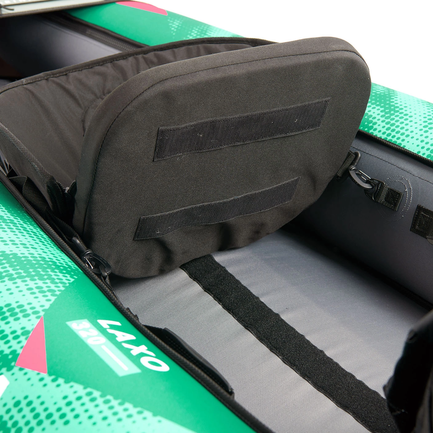 Laxo to niskociśnieniowy, 3-komorowy kajak rekreacyjny dla dwóch osób o długości 320 cm. Wielokomorowość oraz szerokość wynosząca aż 90 cm powoduje, że jest on stabilny oraz bezpieczny nawet dla początkujących wioślarzy. Kajak wyposażono w dwa łatwo zakładane stateczniki (finy) oraz kadłub w kształcie litery V co pozwala na łatwe trzymanie obranego kierunku. Całość została wykonana z bardzo trwałego materiału PVC, który zda egzamin podczas pływania zarówno po jeziorach jak i rzekami. Górna część burt oraz podłoga zostały pokryte materiałem wodoodpornym. Maksymalny udźwig kajaka wynosi aż 180 kg co pozwoli na zabranie większej ilości bagażu (kajak zarówno na dziobie jak i rufie posiada elastyczne linki bungee do przypięcia bagażu) i wybranie się na dłuższą wyprawę. Dwa wysokie, składane siedziska z kieszonkami na bagaż podręczny, zapewnią odpowiedni komfort podczas wiosłowania.