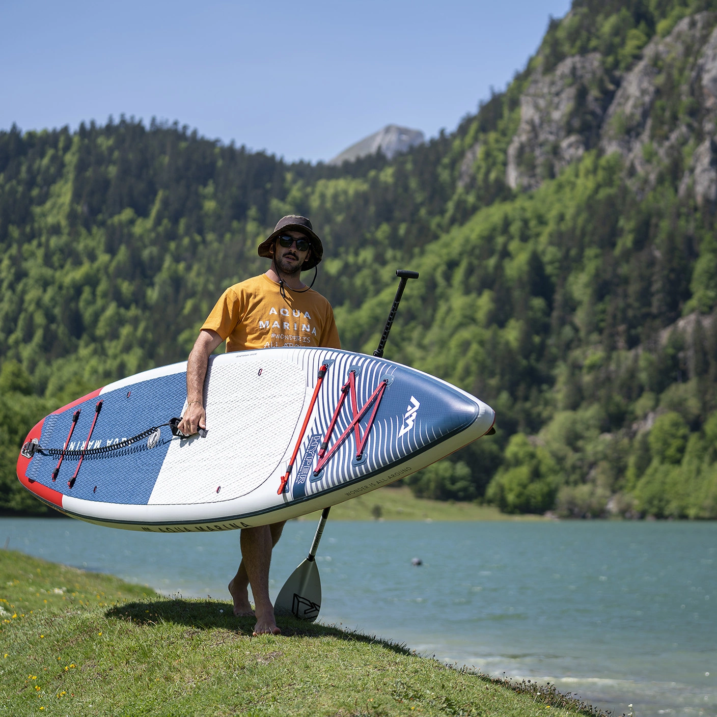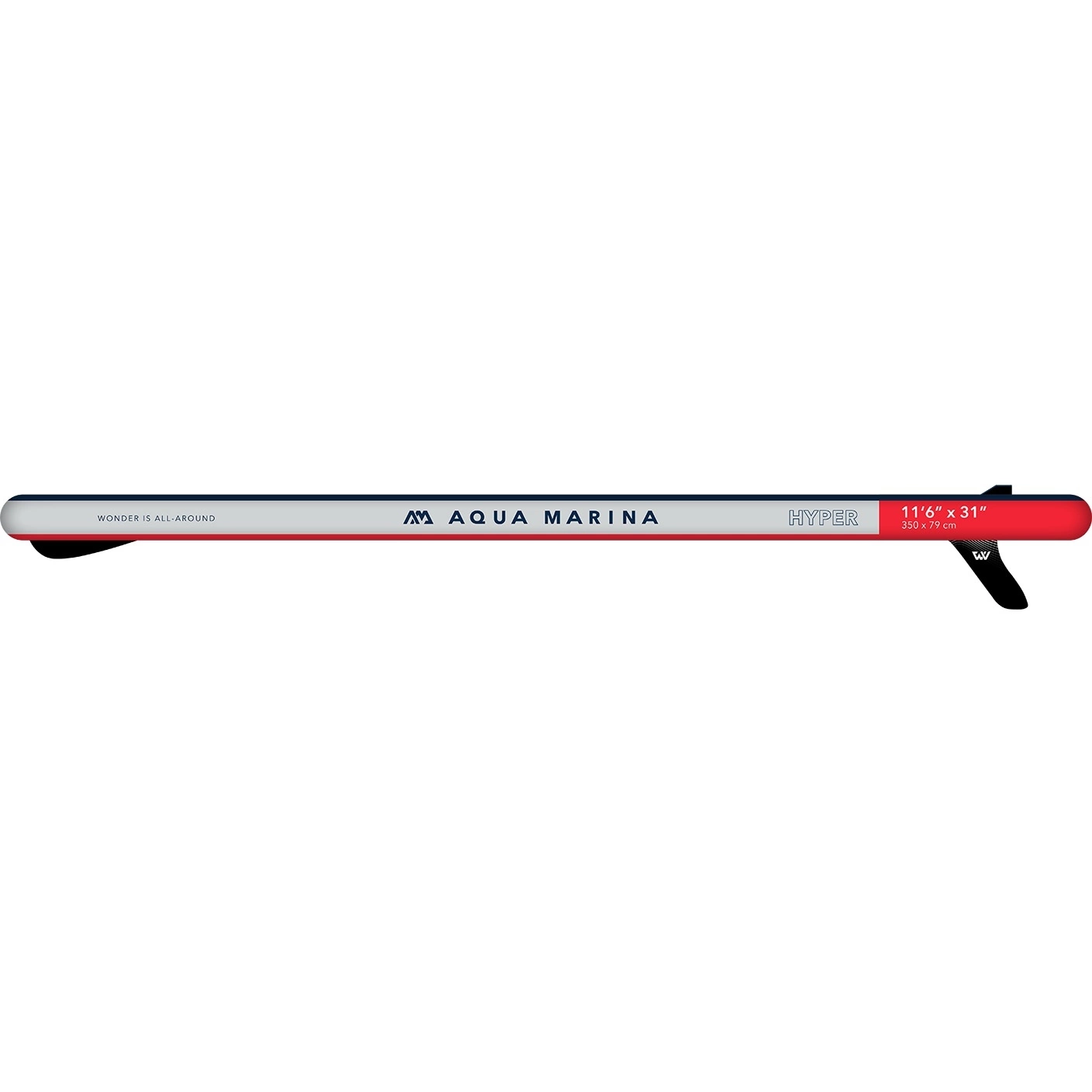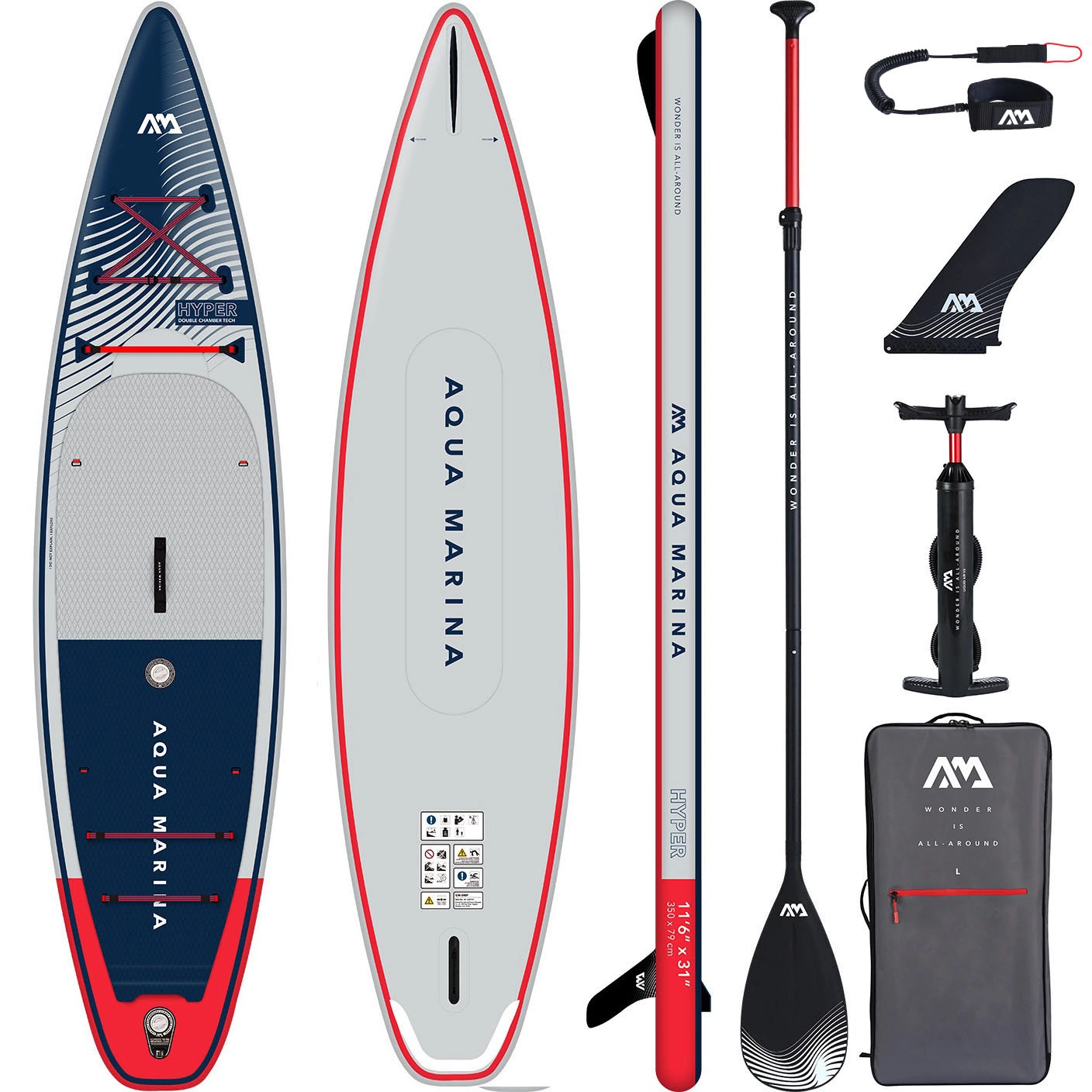 Tegoroczny model Hyper to zaawansowana touringowa deska, którą cechuje podwójna komora (Double Chamber Technology), burty na całej długości wzmocnione drugą warstwą materiału (Double Stringer Technology), dwie linki bungy pozwalające zabrać więcej bagażu, pokrycie grubszą i bardziej przyczepną pianką imitującą piasek - Sand Ripple, kickpad na rufie pozwalający na szybsze wykonywanie zwrotów czy REC Edge™ - technologia zastosowana na rufie zwiększająca efektywność wiosłowania poprzez lepsze odprowadzanie wody. Dodatkowo dziób został wzmocniony technologią Fore Keel™, która pozwala na lepsze trzymanie kierunku podczas wiosłowania oraz chroni deskę przy dobijaniu do brzegu. Akcesoria będące częścią zestawu również są wyższej jakości niż standardowy sprzęt Aqua Marina (skręcona smycz Coil Leash czy ulepszona pompka Liquid Air V2). Paddleboard posiada mocowania typu d-ring, które pozwalają na przymocowanie siedziska kajakowego i pływanie na siedząco. Nie jest ono częścią zestawu ale znajdziesz je tutaj.