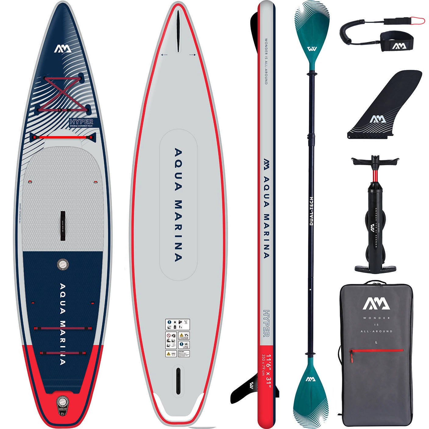 Tegoroczny model Hyper to zaawansowana touringowa deska, którą cechuje podwójna komora (Double Chamber Technology), burty na całej długości wzmocnione drugą warstwą materiału (Double Stringer Technology), dwie linki bungy pozwalające zabrać więcej bagażu, pokrycie grubszą i bardziej przyczepną pianką imitującą piasek - Sand Ripple, kickpad na rufie pozwalający na szybsze wykonywanie zwrotów czy REC Edge™ - technologia zastosowana na rufie zwiększająca efektywność wiosłowania poprzez lepsze odprowadzanie wody. Dodatkowo dziób został wzmocniony technologią Fore Keel™, która pozwala na lepsze trzymanie kierunku podczas wiosłowania oraz chroni deskę przy dobijaniu do brzegu. Akcesoria będące częścią zestawu również są wyższej jakości niż standardowy sprzęt Aqua Marina (skręcona smycz Coil Leash czy ulepszona pompka Liquid Air V2). Paddleboard posiada mocowania typu d-ring, które pozwalają na przymocowanie siedziska kajakowego i pływanie na siedząco. Nie jest ono częścią zestawu ale znajdziesz je tutaj.