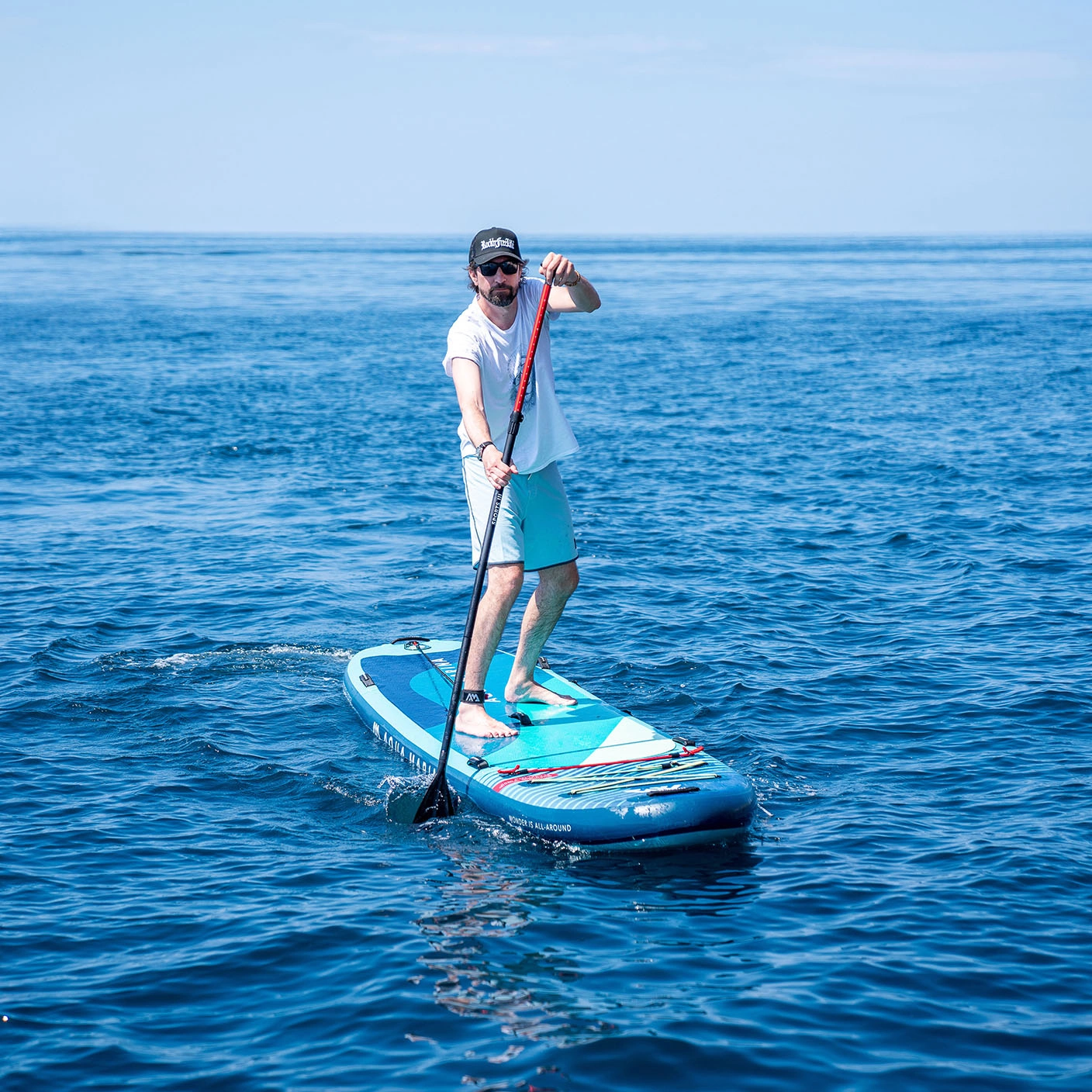 Z maksymalną nośnością 220 kg, SUP umożliwia pływanie w większym gronie, także z dziećmi lub zwierzakami. Wyposażona w system linek bungee do mocowania bagażu oraz statecznik Swift Attach Fin System który umożliwia szybki montaż, deska jest zarówno funkcjonalna, jak i łatwa w transporcie dzięki uchwytom. To świetny wybór na rodzinne wyprawy na wodzie. Paddleboard nie posiada mocowań typu d-ring, które pozwalają na przymocowanie siedziska kajakowego i pływanie na siedząco. Zestaw oryginalnie nie zawiera wiosła oraz leasha, które należy dokupić osobno. Znajdziesz je w naszej ofercie.
