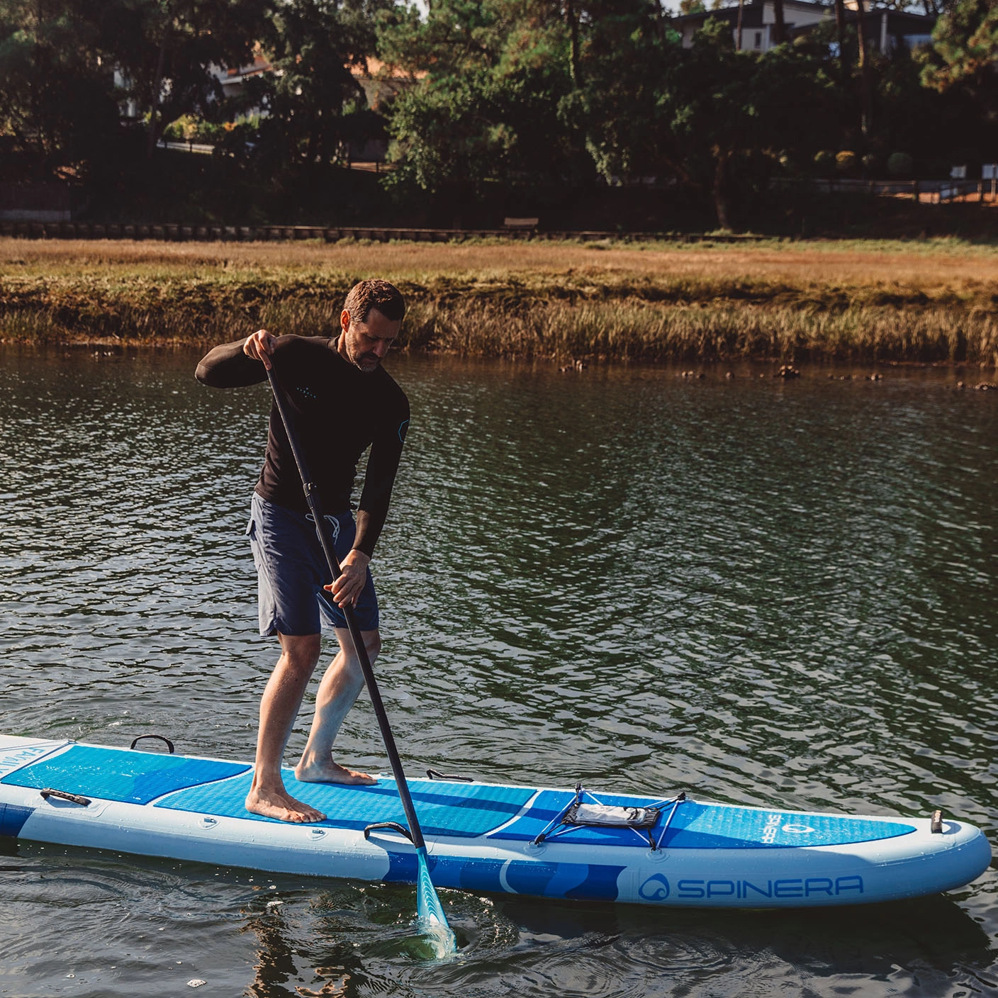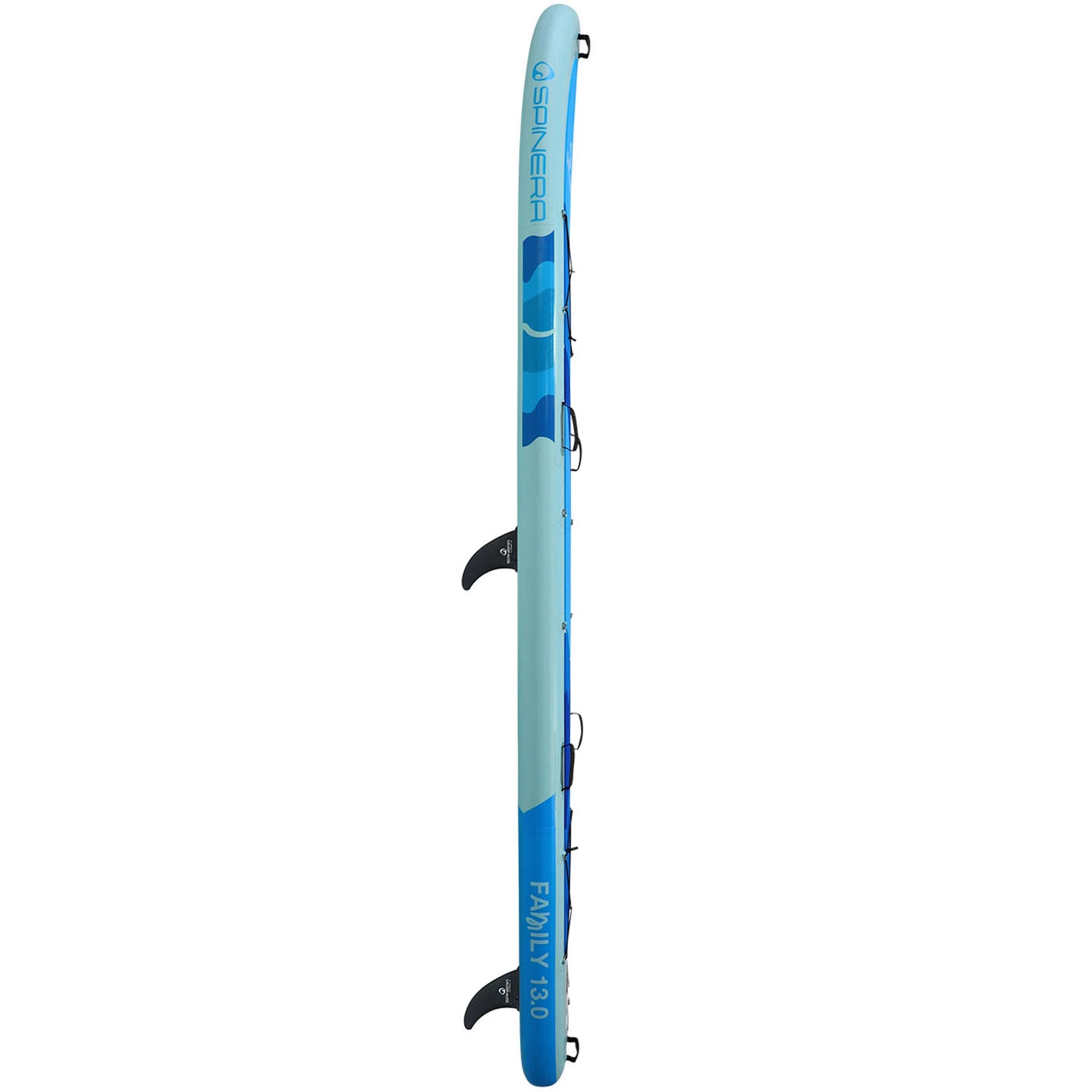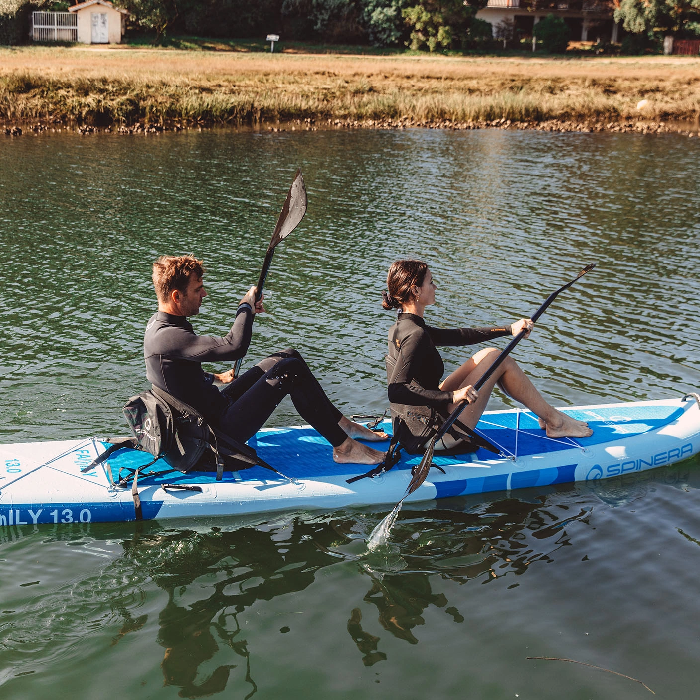 Model Spinera SUP Family 13'0" posiada podwójny system linek bungee zarówno na dziobie, jak i rufie, co umożliwia łatwe przechowywanie sprzętu. Kolejnym atutem jest zestaw zaczepów do siedzisk kajakowych – umożliwiają one zamocowanie dwóch siedzisk, dzięki czemu można wiosłować na siedząco z inną osobą.