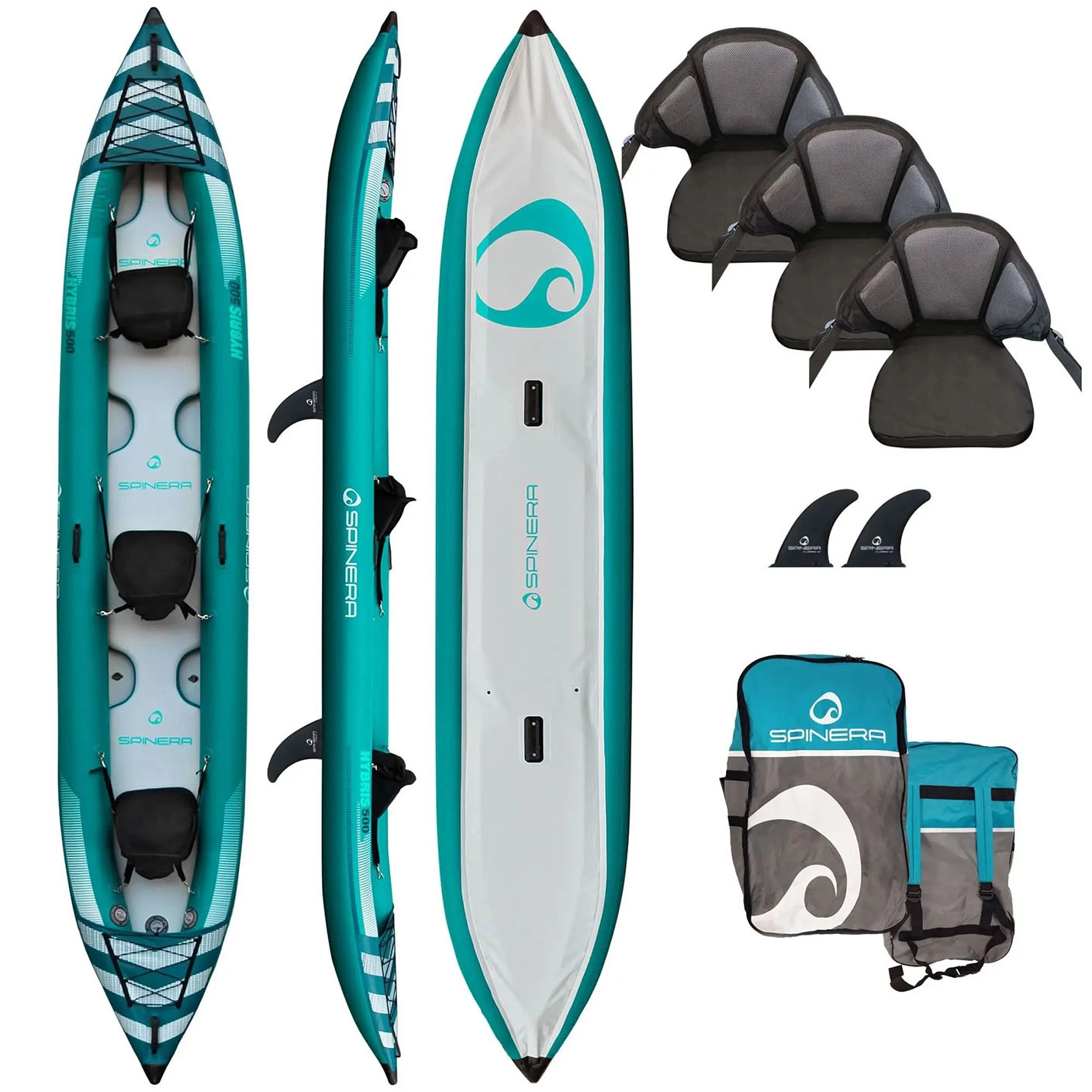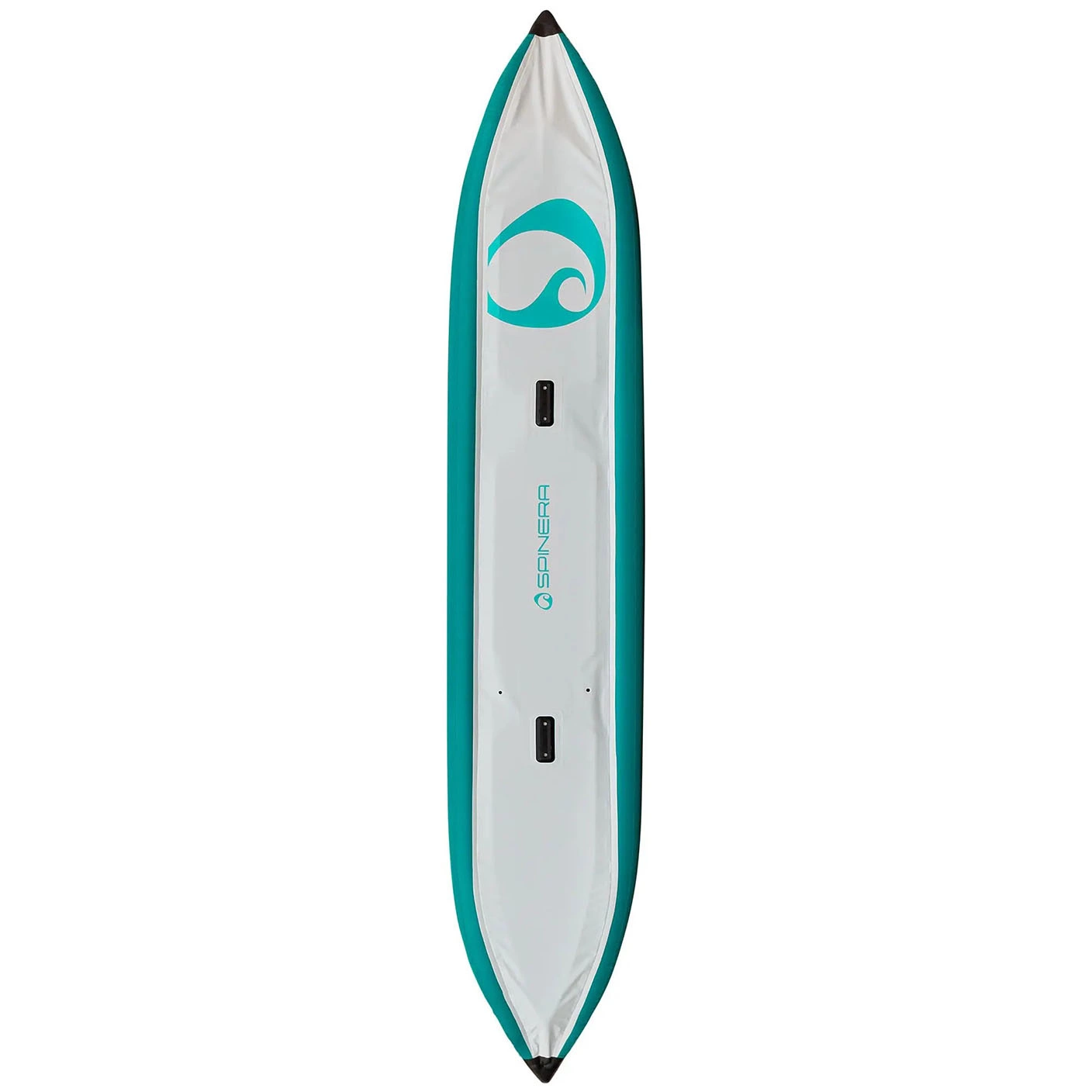 Spinera to austriacka marka specjalizująca się w sprzęcie wodnym, w tym w nowoczesnych kajakach hybrydowych. Ich nazwa pochodzi od unikalnego połączenia dwóch typów pompowanych komór. Dno wykonano w technologii drop-stitch, która zapewnia wysoką sztywność i lepsze osiągi, natomiast burty z niskim ciśnieniem gwarantują stabilność na wodzie. Taka konstrukcja sprawia, że kajaki hybrydowe są niezwykle uniwersalne – doskonale nadają się zarówno do spokojnych wypraw po jeziorach, jak i do pokonywania bardziej wymagających tras rzecznych. Dzięki dwóm statecznikom model Hybris cechuje się dobrą manewrowością oraz stabilnym prowadzeniem podczas ślizgu. Kajak może unieść do 275 kg, co umożliwia zabranie większej ilości bagażu – przewidziano na niego miejsce zarówno na dziobie, jak i na rufie, zabezpieczone linką bungee.